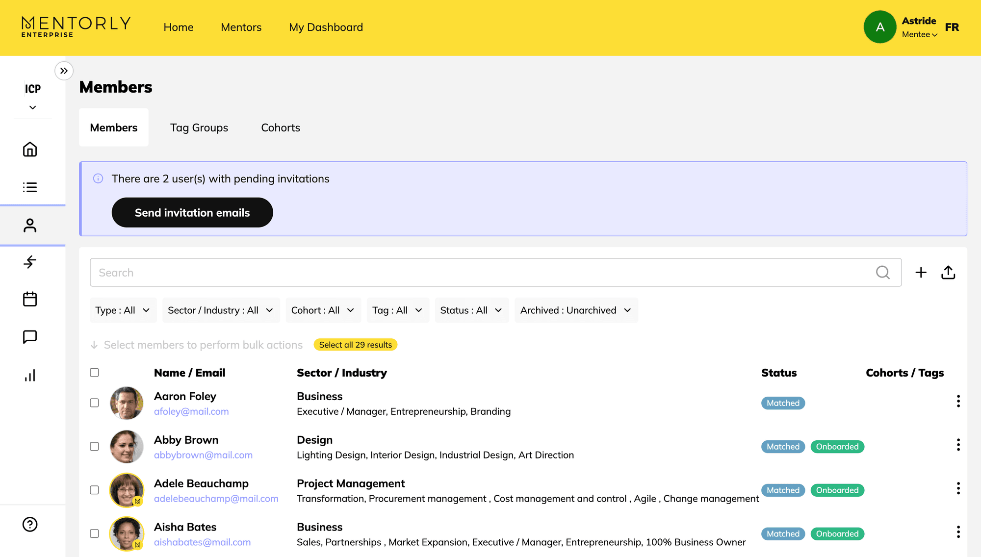 We recommend adding yourself to the program (from the Members tab) as either a mentor and mentee to explore what Mentorly has to offer members of your program.