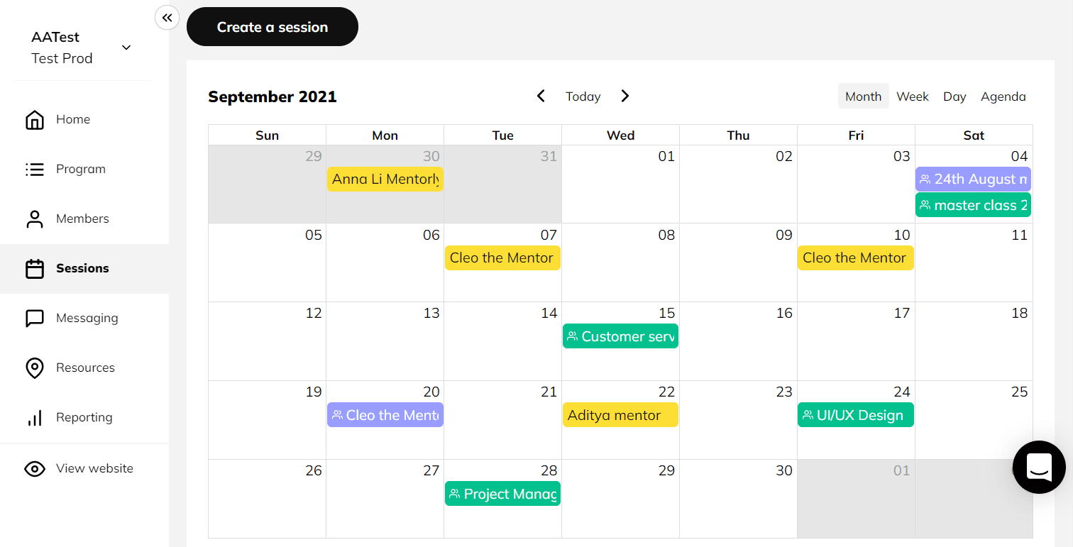 The Sessions tab will give you a monthly, weekly or daily overview of sessions being held within the program.