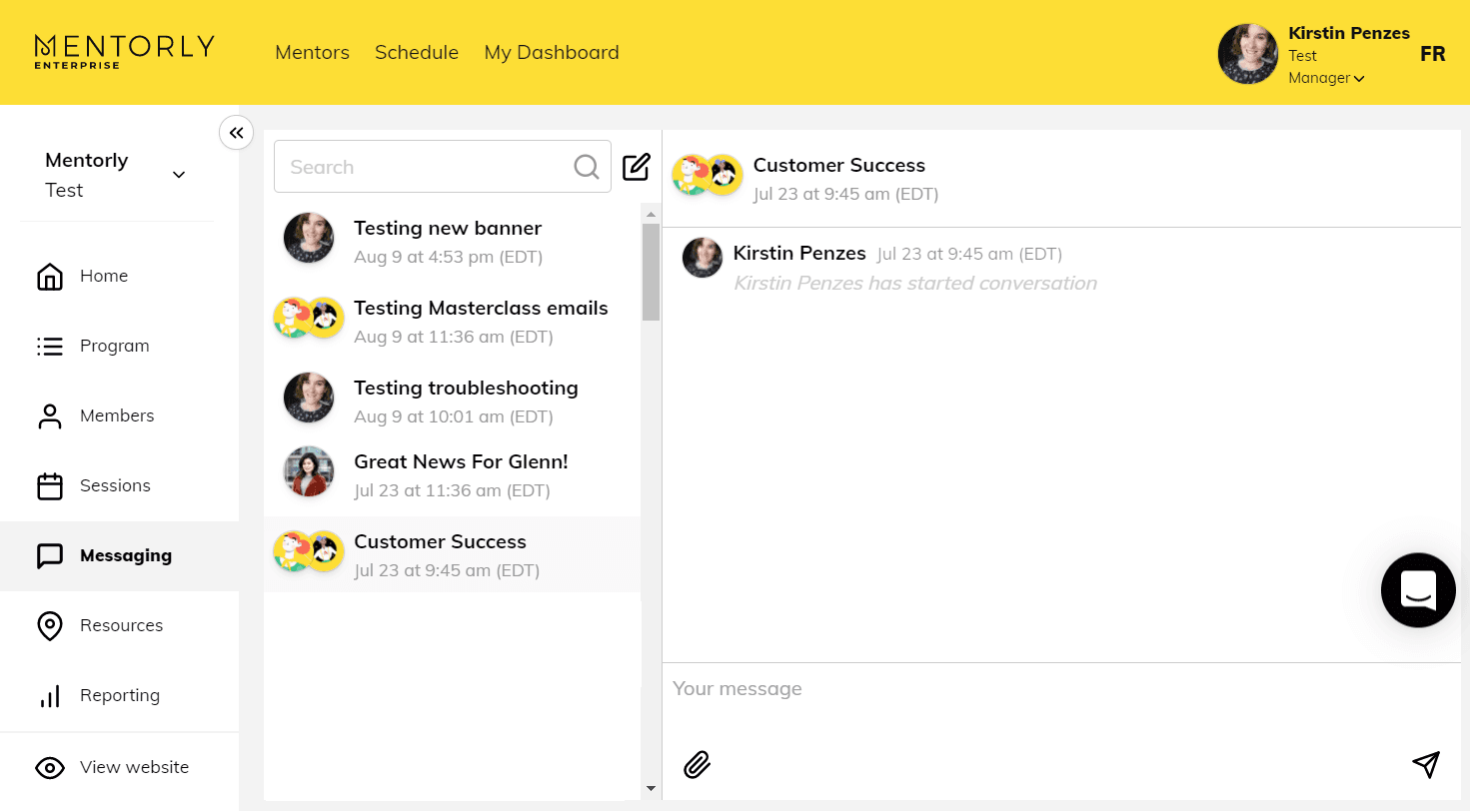 Mentorly Messaging is a helpful tool discuss your sessions or even share news and files - it keeps all the communication in one place on the platform! As a Program Manager, you also have the option to send read-only Announcements.
