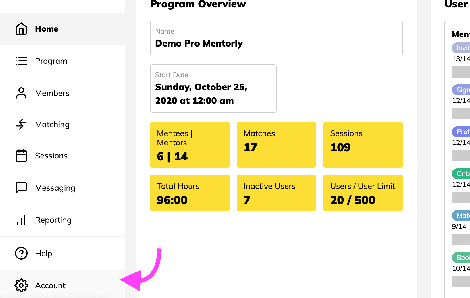 1. Log in to Mentorly: Access the Account tab in the bottom of the menu on the left-hand side of the screen.