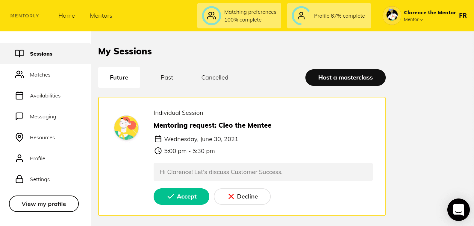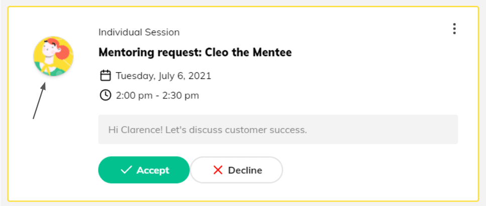 When a session is requested, you will be able to review the mentee that requested it, the date and time, as well as their message that will explain what they would like to discuss in the session.